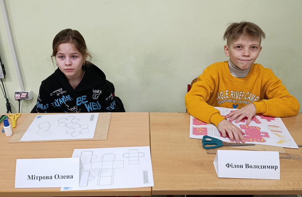 Друга група виконувала завдання з об’ємного моделювання – створення паперової моделі за наданою розгорткою. Цей етап вимагав від учасників уважності, просторової уяви, акуратності та вміння працювати відповідно до креслень і технологічних вимог.