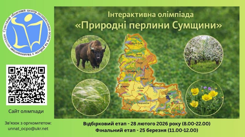 З метою формування національної свідомості, популяризації об’єктів і територій природно-заповідного фонду Сумської області як національного багатства України, природоохоронної роботи засобами еколого-натуралістичної творчості у лютому – березні 2026 року буде проведено інтерактивну олімпіаду «Природні перлини Сумщини».