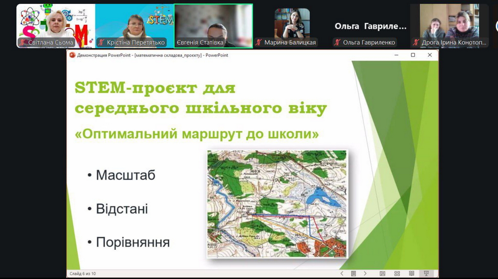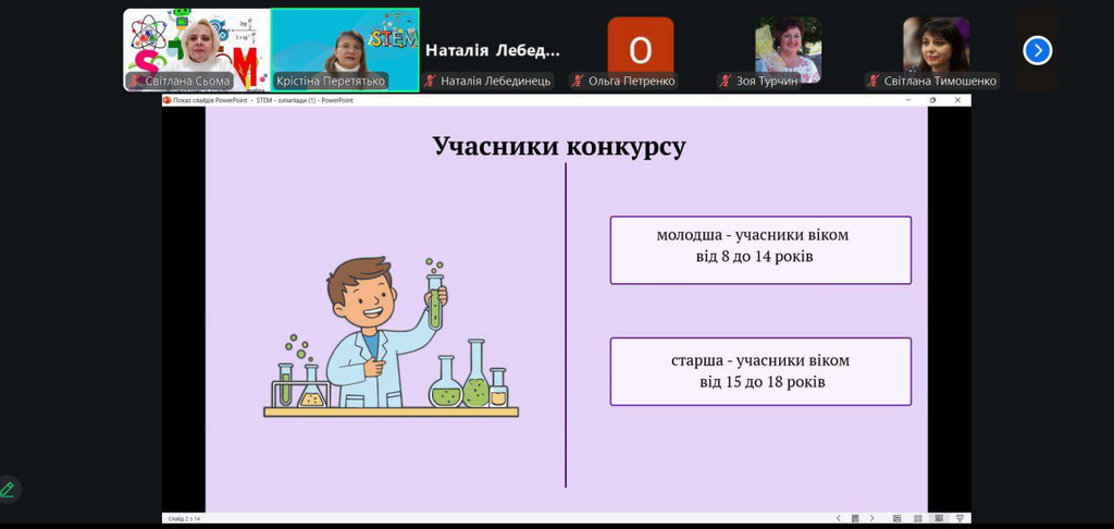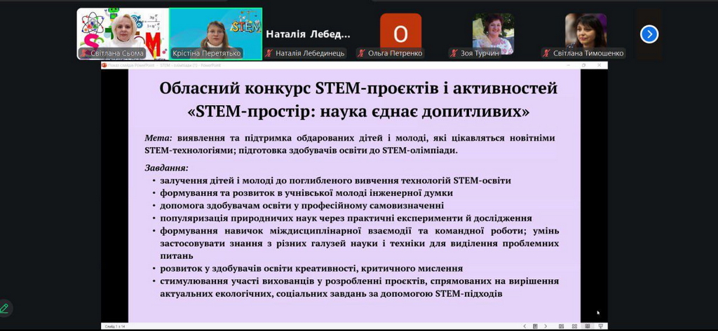 Спільно із спікером Кристиною Перетятько учасники опрацювали алгоритм участі в обласному конкурсі STEM-проєктів і активностей «STEM-простір: наука єднає допитливих», який було презентовано як ефективний тренувальний простір і важливу підготовчу сходинку на шляху здобувачів освіти до участі в STEM-олімпіаді. Акцент було зроблено на розвитку в дітей та молоді дослідницьких умінь і навичок, формуванні творчого й критичного мислення, а також на розвиток навичок командної взаємодії.