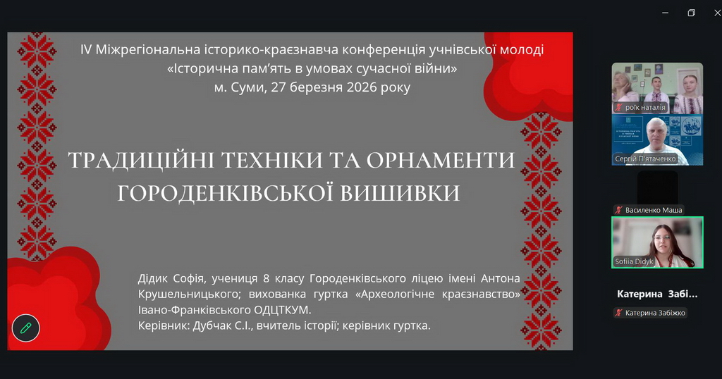 27 березня 2026 року відбулася ІV Міжрегіональна історико-краєзнавча конференція учнівської молоді «Історична пам’ять в умовах сучасної війни», організована Департаментом освіти і науки Сумської обласної державної адміністрації та Сумським обласним центром позашкільної освіти та роботи з талановитою молоддю.