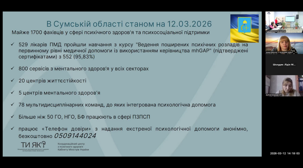 Учасників заходу привітала Олена Кірєєва, заступниця голови Сумської обласної державної адміністрації-начальника обласної військової адміністрації, Жанна Сидоренко, регіональний координатор Всеукраїнської програми ментального здоров’я «Ти як?» у Сумській області окреслила основні вектори реалізації програми щодо формування в суспільстві культури піклування про ментальне здоров’я.