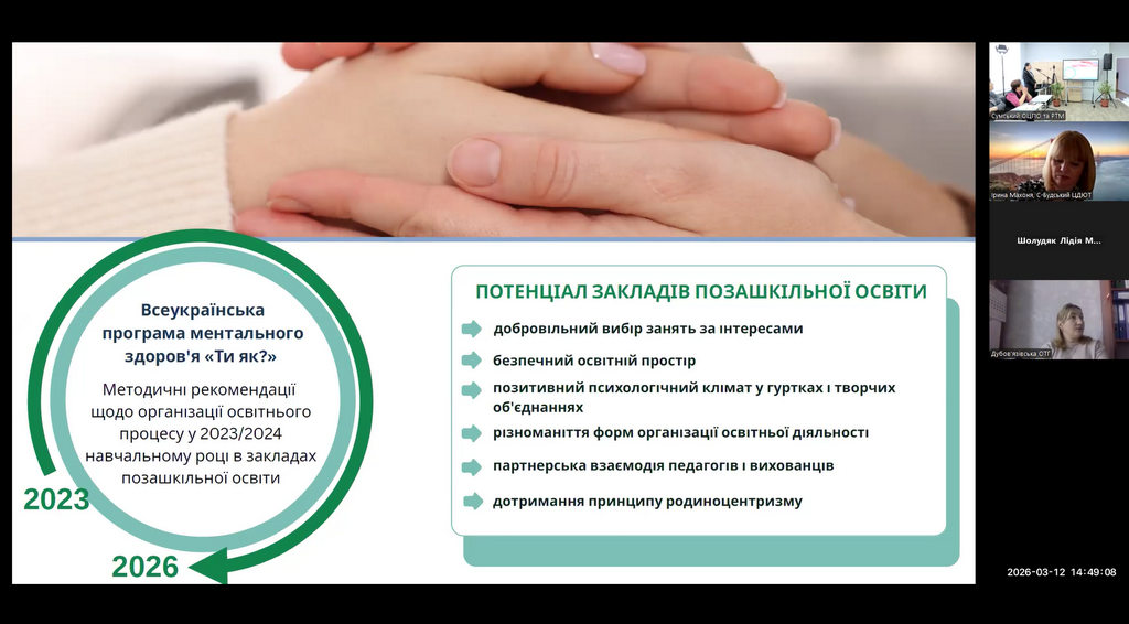Роботу за завданнями Всеукраїнської програма ментального здоров’я «Ти як?» в закладах позашкільної освіти буде продовжено у співпраці з громадськими організаціями, службами соціального захисту населення, батьківською громадськістю.